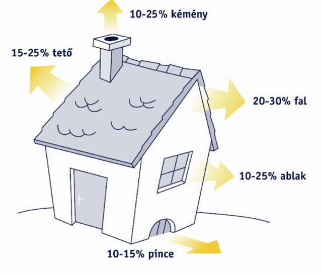 Az épület hővesztesége az esetek nagy többségében az alábbiak szerint oszlik meg: